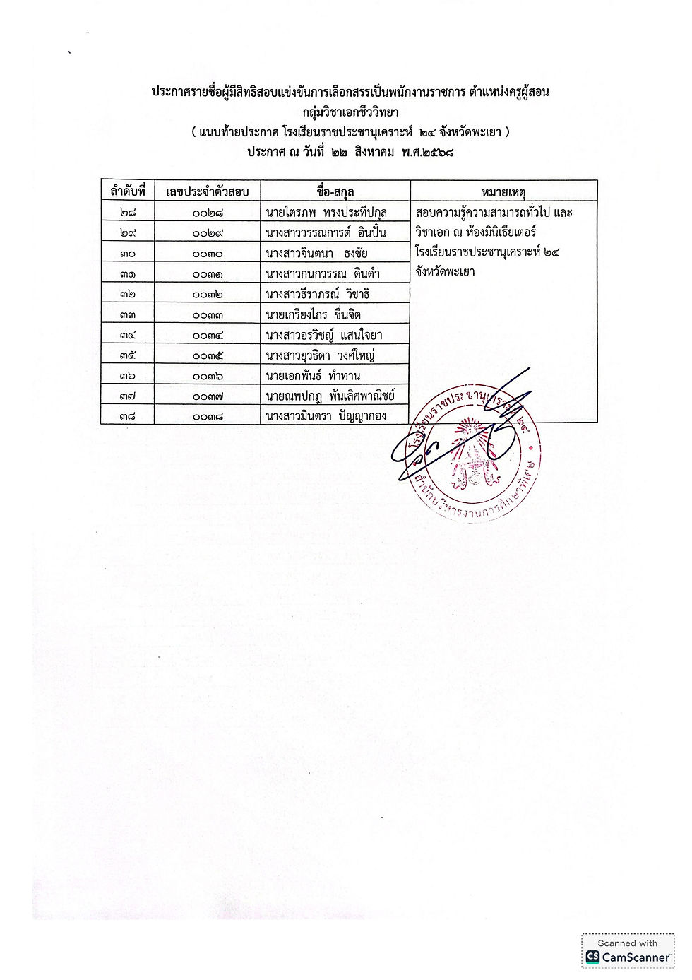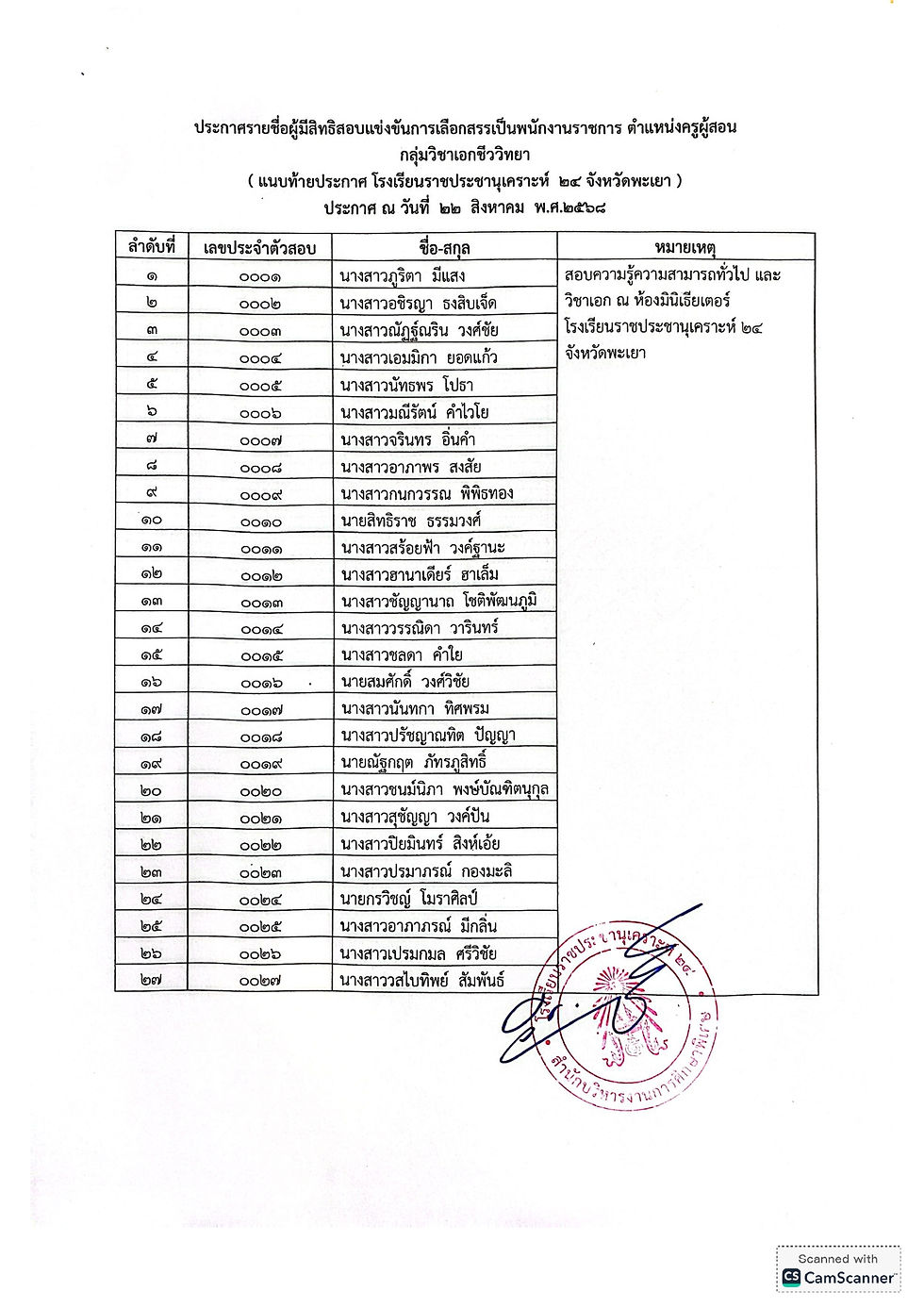 ตามที่โรงเรียนราชประชานุเคราะห์ ๒๔ จังหวัดพะเยา ได้ดำเนินการเปิดรับสมัครบุคคลเพื่อเลือกสรรเป็นพนักงานราชการในตำแหน่งครูผู้สอน บัดนี้ โรงเรียนได้ทำการตรวจสอบคุณสมบัติของผู้สมัครเสร็จสิ้นแล้ว จึงขอประกาศรายชื่อผู้มีสิทธิเข้ารับการเลือกสรร ดังนี้