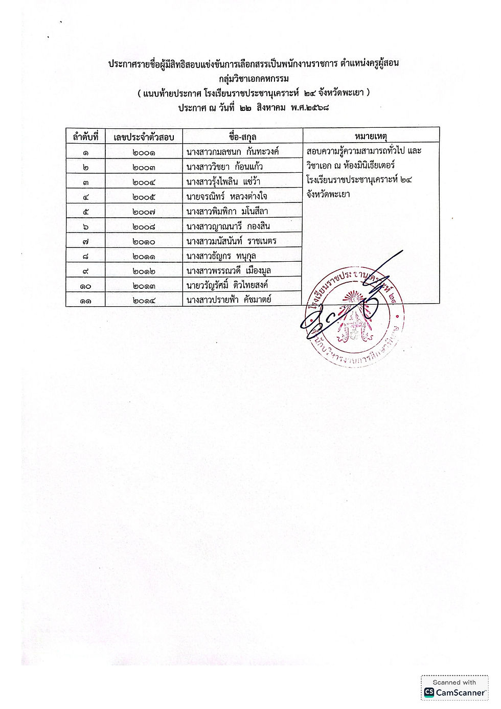 ประกาศรายชื่อผู้มีสิทธิเข้ารับการเลือกสรรเป็นพนักงานราชการ ตำแหน่ง ครูผู้สอน